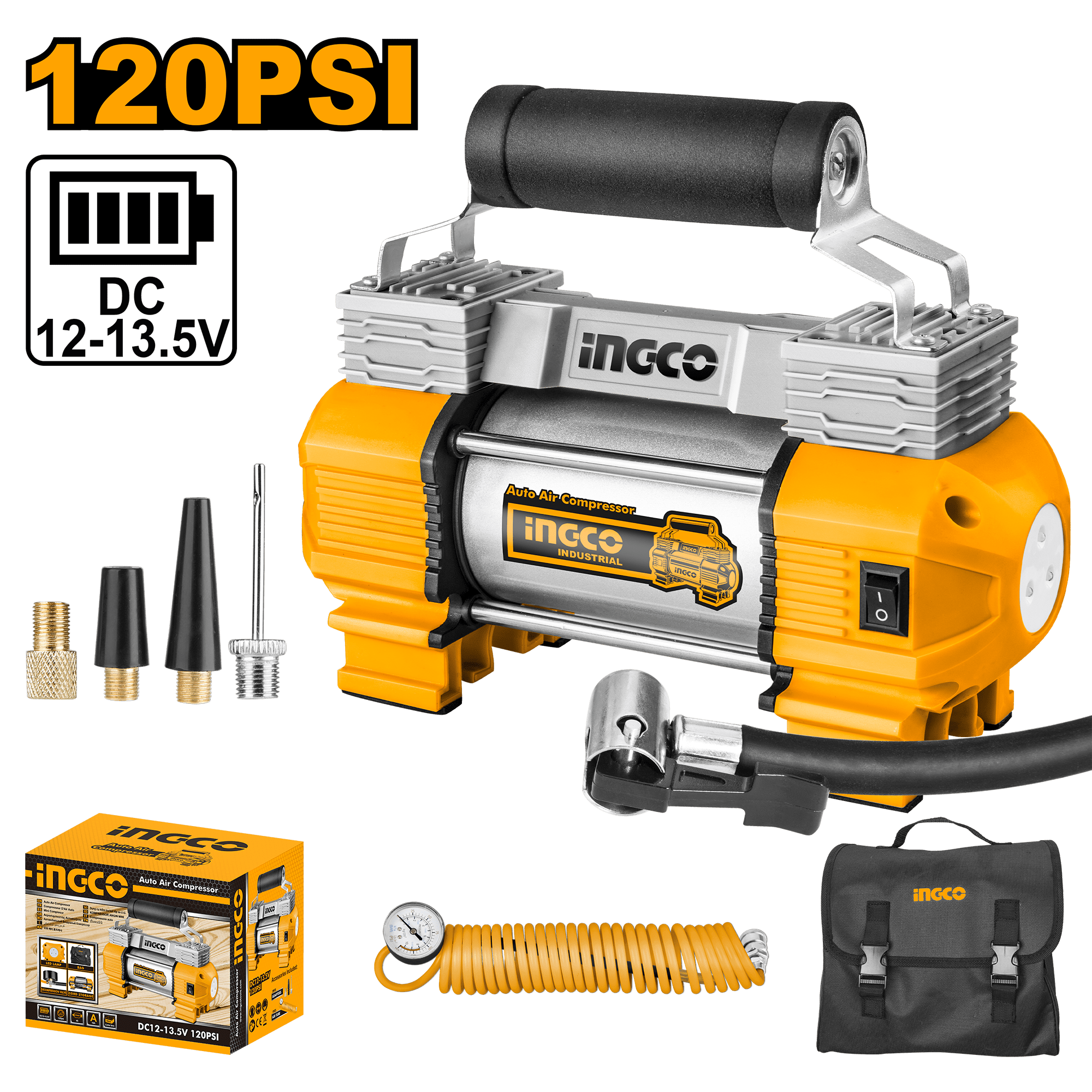 The Ingco 120PSI Auto Air Compressor AAC2508 is your go-to solution for quick and easy inflation on the road. Whether you’re topping off your car tires, inflating sports equipment, or using it for other inflatables, this compressor delivers reliable performance in a compact design. With a maximum pressure of 120PSI, it ensures that you can handle any inflation task efficiently, making it an essential tool for every vehicle owner.