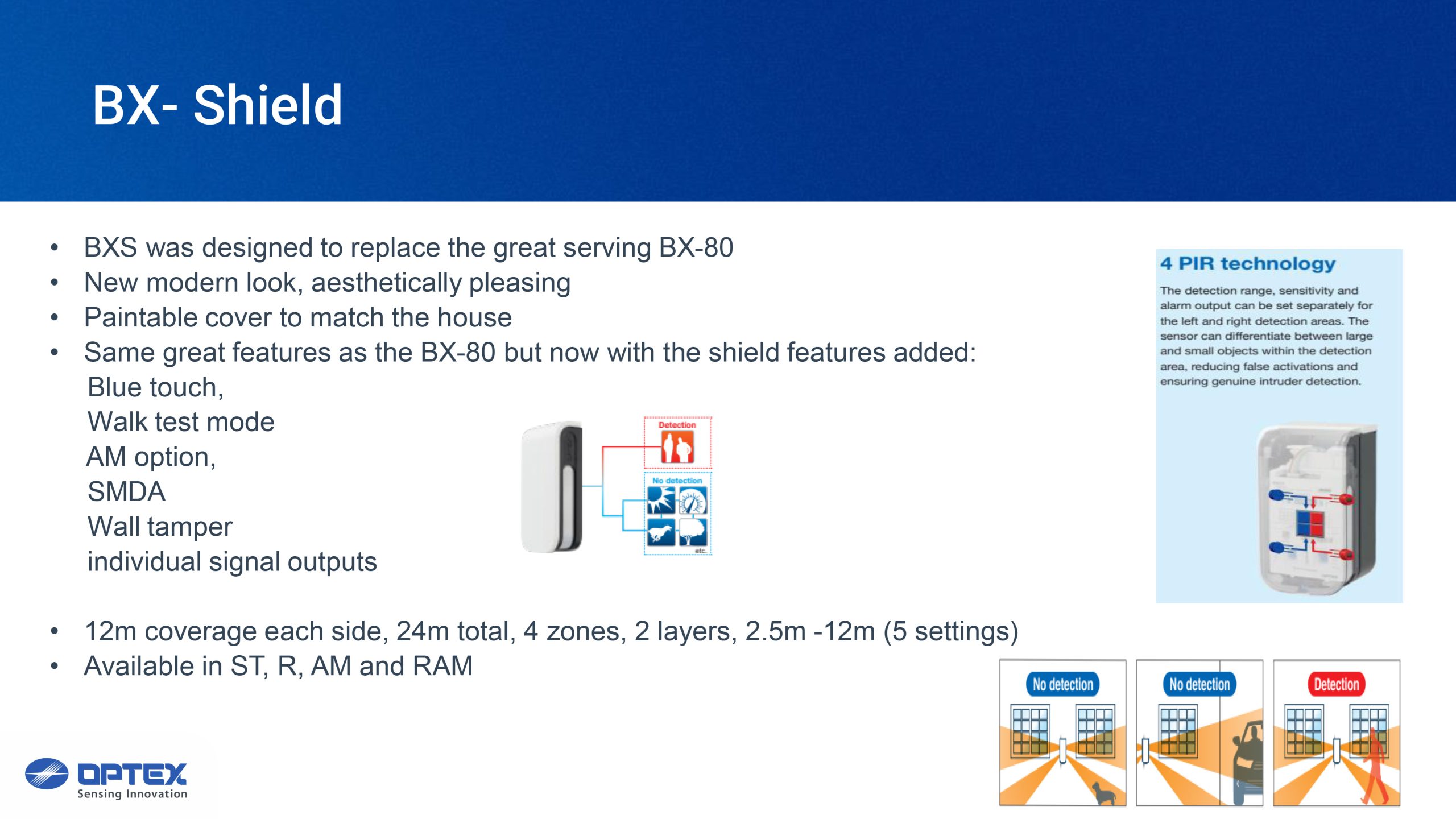 OPTEX BXS SHIELD wired outdoor PIR, 24m dual long range left & right independent zones, adjustable detection area on either side