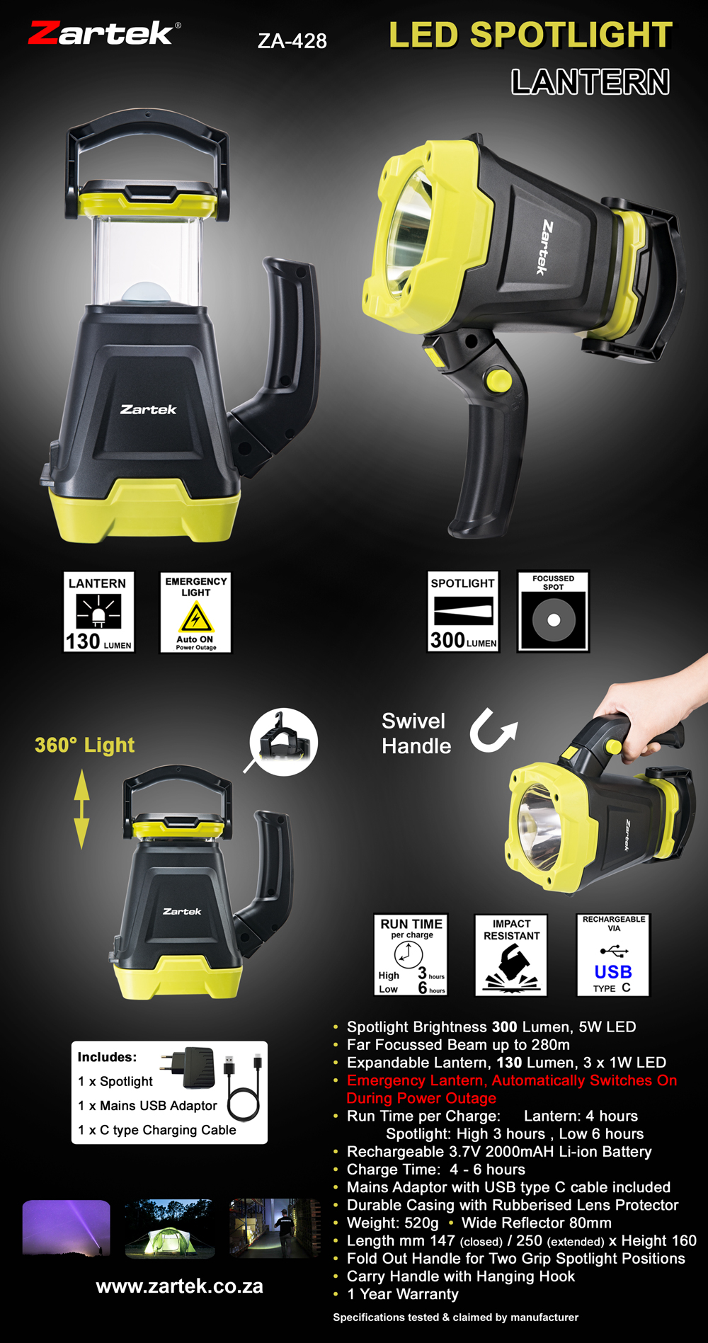 Run Time per Charge: Lantern: 4 hours, Spotlight: High 3 hours , Low 6 hours